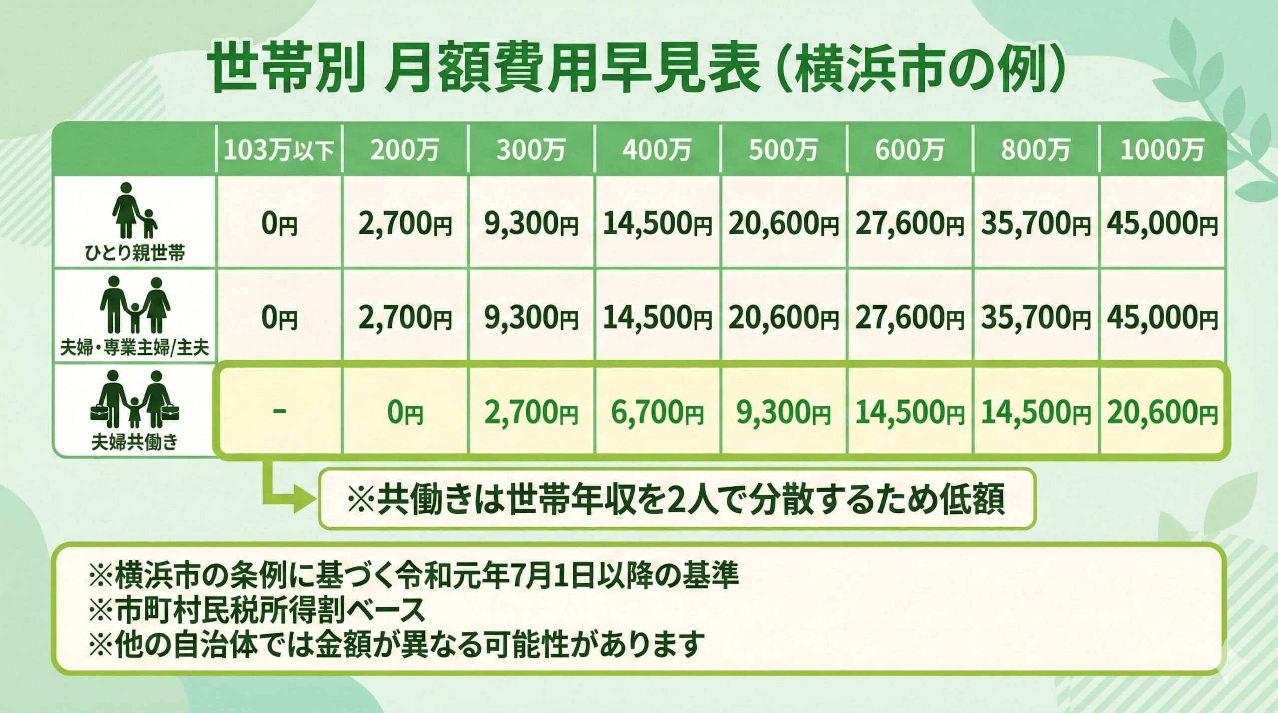 ここでは、横浜市の基準に基づいて、具体的にどのくらいの費用がかかるのか、世帯タイプ別にシミュレーションします。世帯構成によって適用される控除が異なるため、同じ年収でも支払う費用に大きな差が出ます。